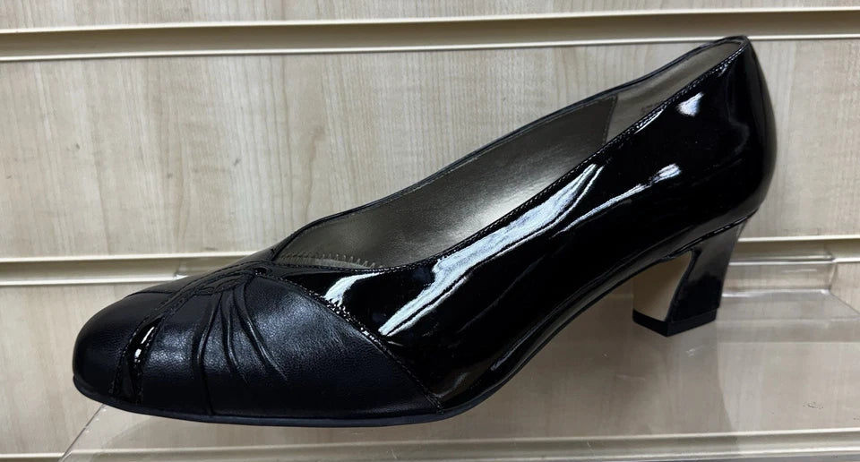 Equity Monique Ladies WIDE E FIT Classc Black Patent Leather Mid Heel Court Shoes Vintage Style