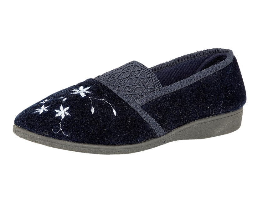 Zedzzz Joanna Womens WIDE FIT(EE) Navy Blue Velour Soft Elasticated Full Slippers With Floral Design