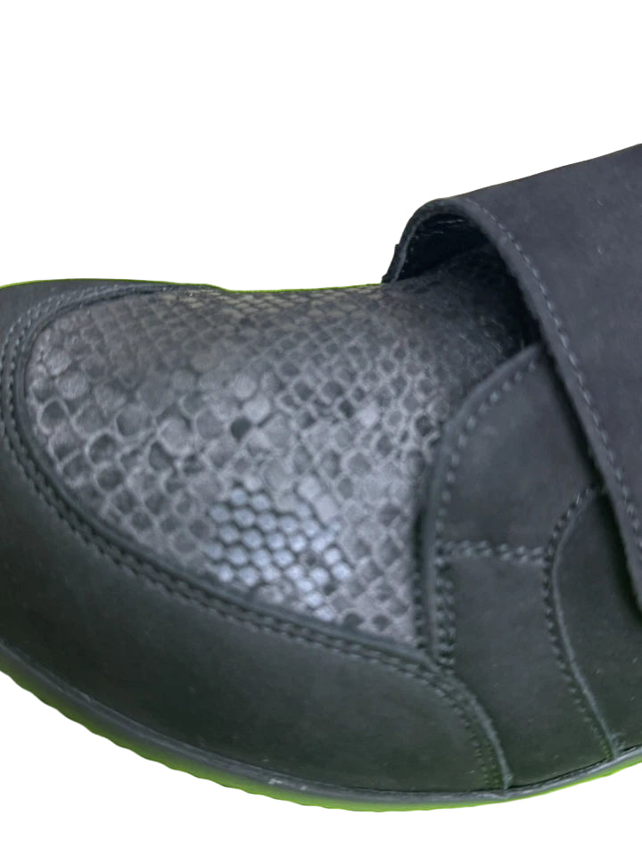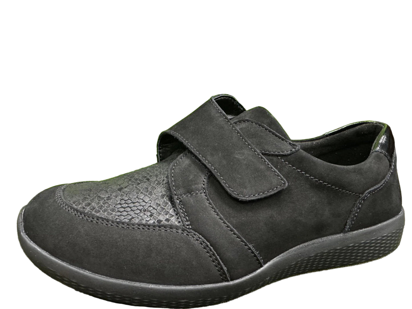 Soft Black Leather & Lycra This Low Shoe For Women Combines Its Attractive Appearance With Special Comfort. With The Adjustable Riptape Strap, It Is Ideal For Sensitive feet: Lightweight PU Sole, Removable Fleece Insole And Comfortable M-Width.